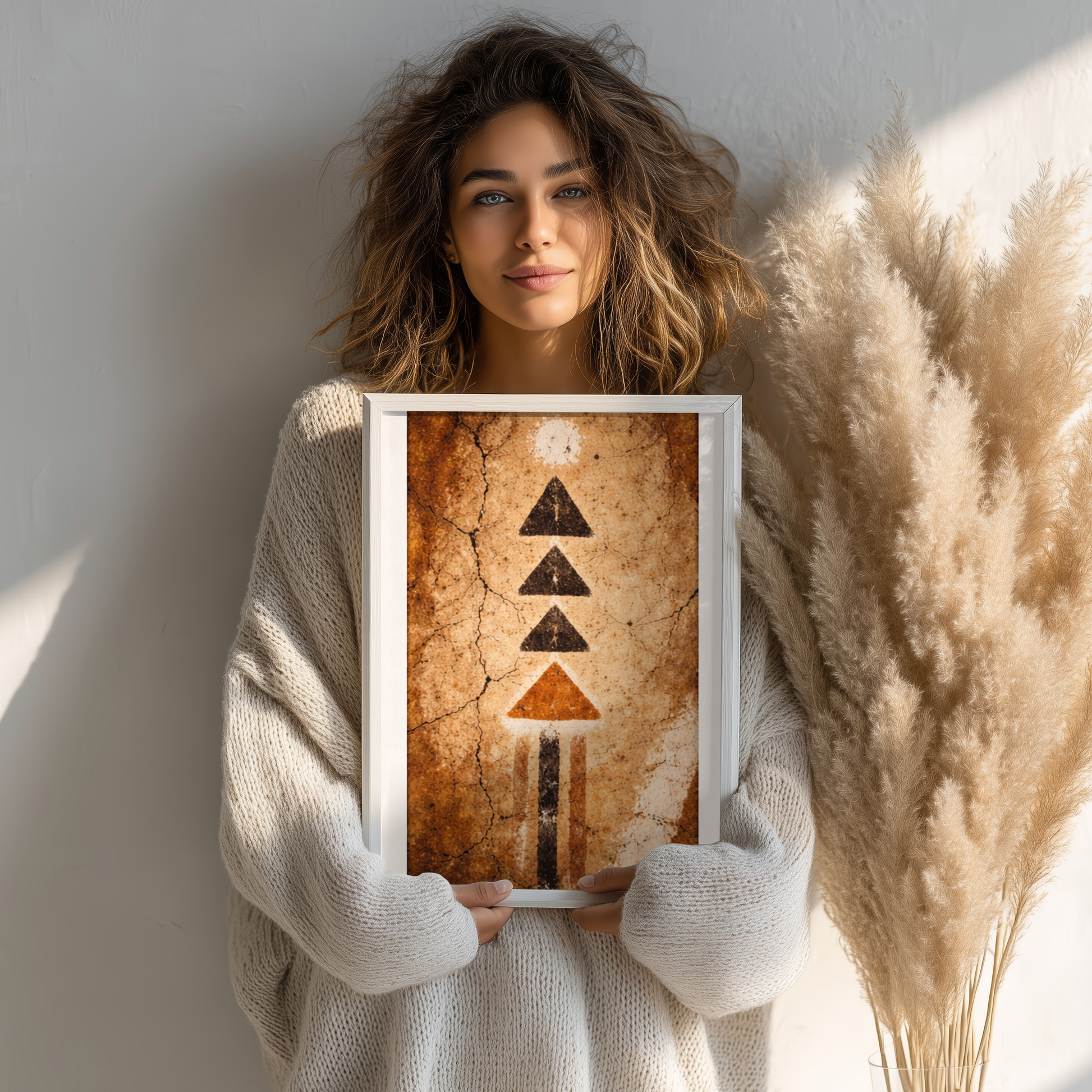 A striking geometric wall artwork inspired by primitive symbols, African-inspired aesthetics and natural earth tones. The composition features a vertical sequence of triangular shapes culminating in a bold directional arrow, set against a textured background that resembles aged stone or weathered clay.