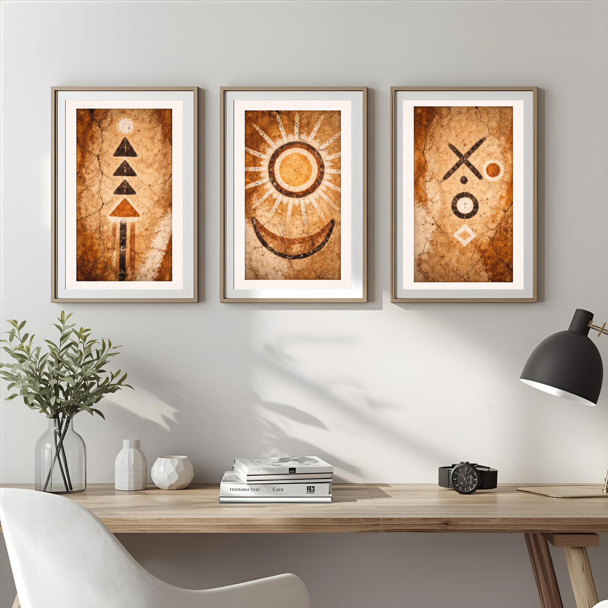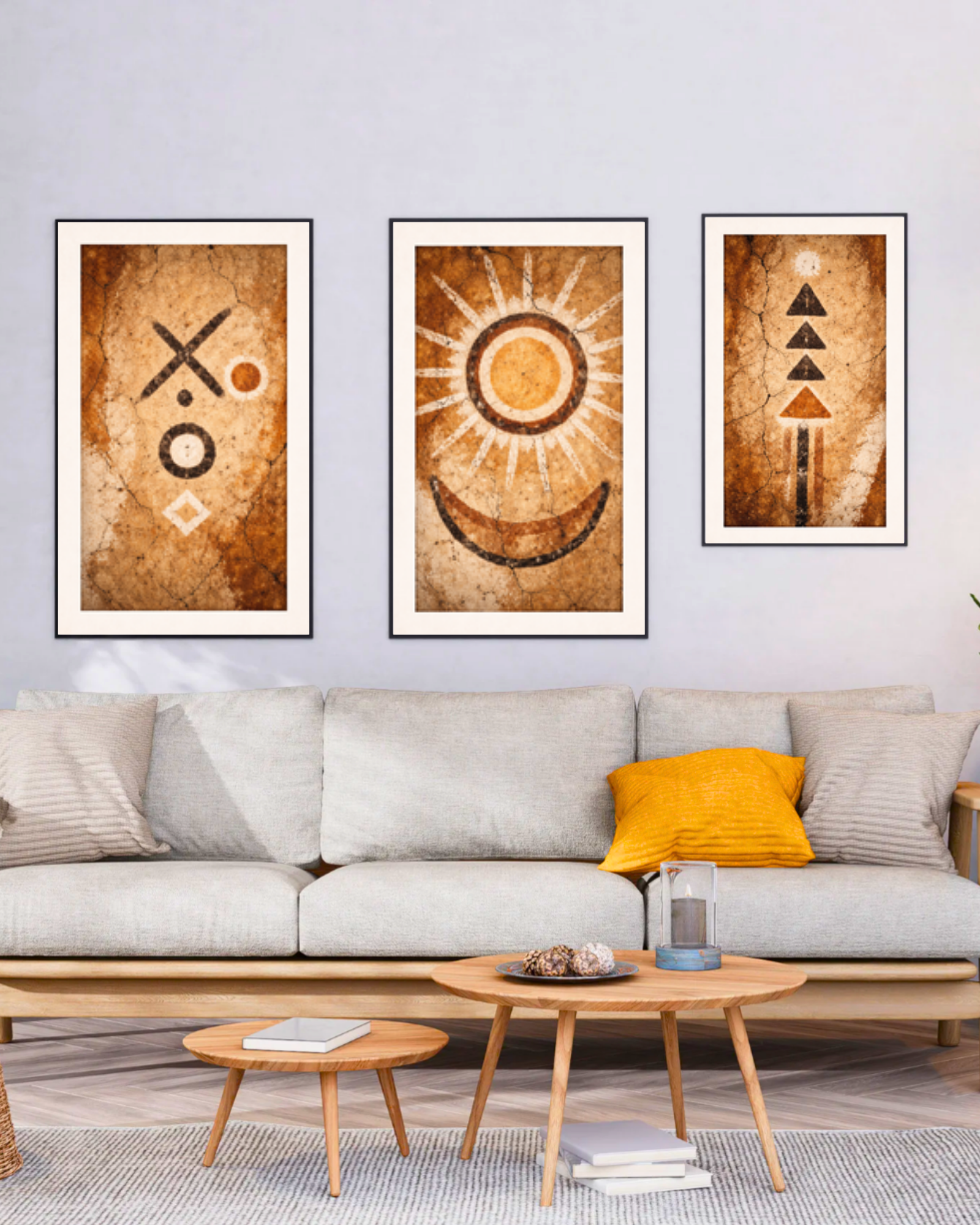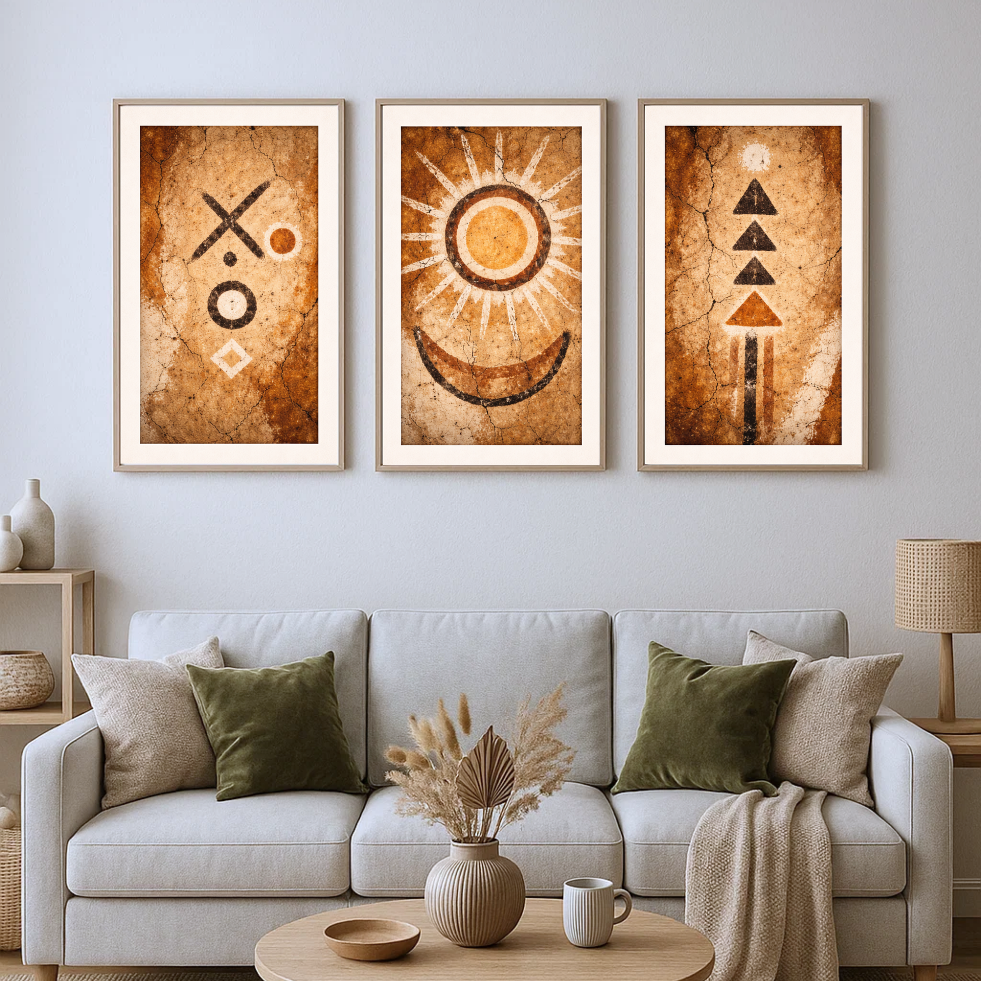 The artwork blends minimalist geometry with an Afrohemian design spirit — a style that combines African-inspired artistic expression with bohemian warmth and natural textures. The palette of ochre, sand and burnt orange creates a grounded and organic atmosphere that works beautifully in Afrohemian, bohemian, rustic and modern minimalist interiors.