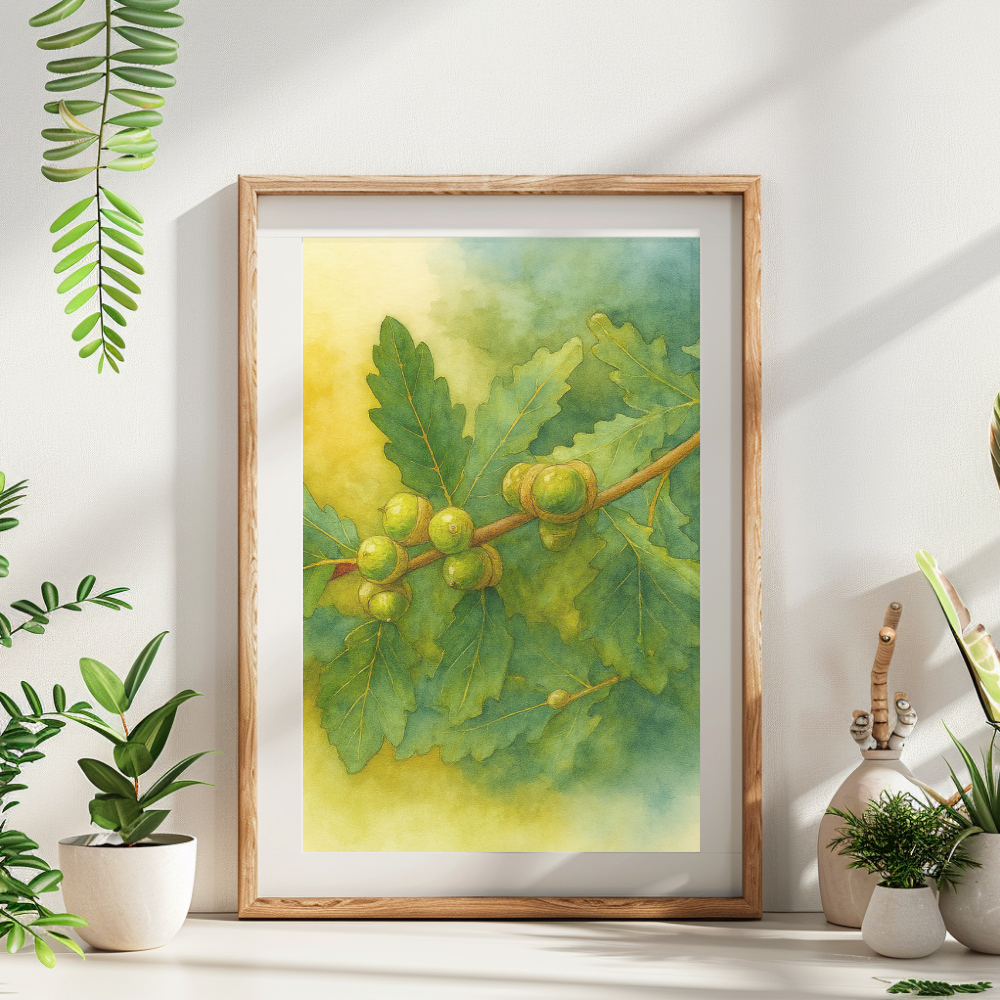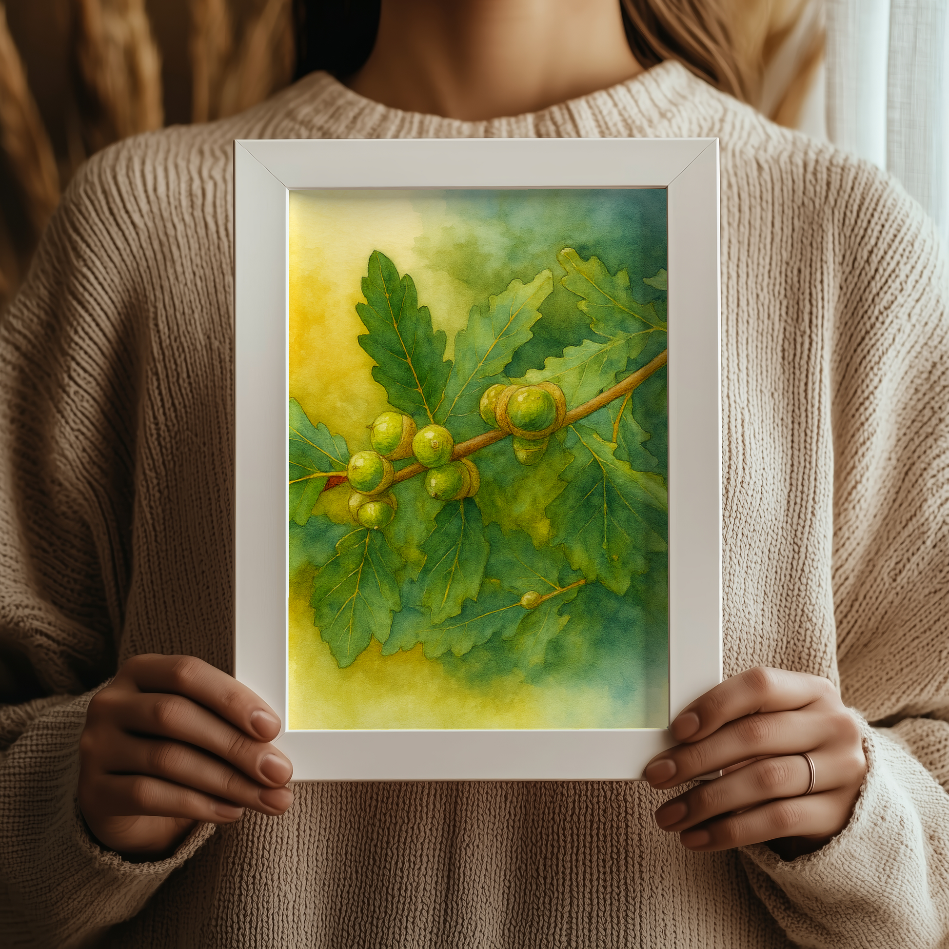Mjuka akvarelltoner och noggranna detaljer framhäver ekens karakteristiska flikiga blad och ekollon – bestående symboler för visdom, motståndskraft och tillväxt. Den balanserade kompositionen och naturliga färgpaletten skapar en lugn och elegant visuell närvaro som passar både moderna och traditionella interiörer.