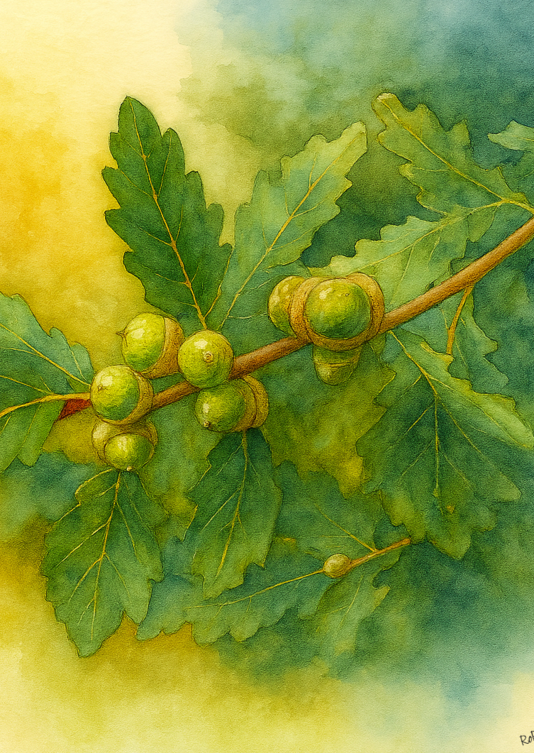 Denna botaniska illustration i akvarellstil fångar ekens organiska struktur med balans och återhållsamhet, vilket låter textur, form och ton skapa ett lugnt men värdigt visuellt uttryck.