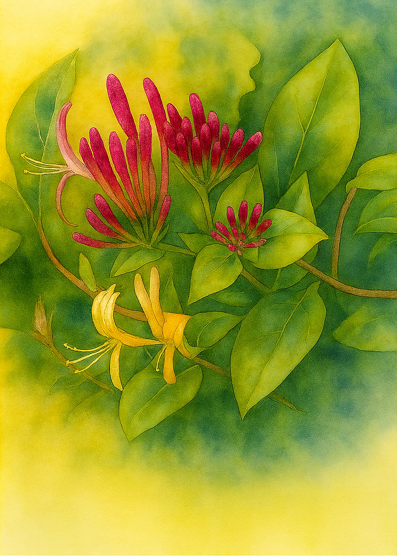 Denna botaniska akvarellillustration framhäver organisk struktur och mjuka rörelser inom växten. Subtila färgövergångar och noggrant observerade former gör att vildkaprifolen framstår som både delikat och levande, vilket skapar ett raffinerat dekorativt stycke med rötter i skandinavisk natur.