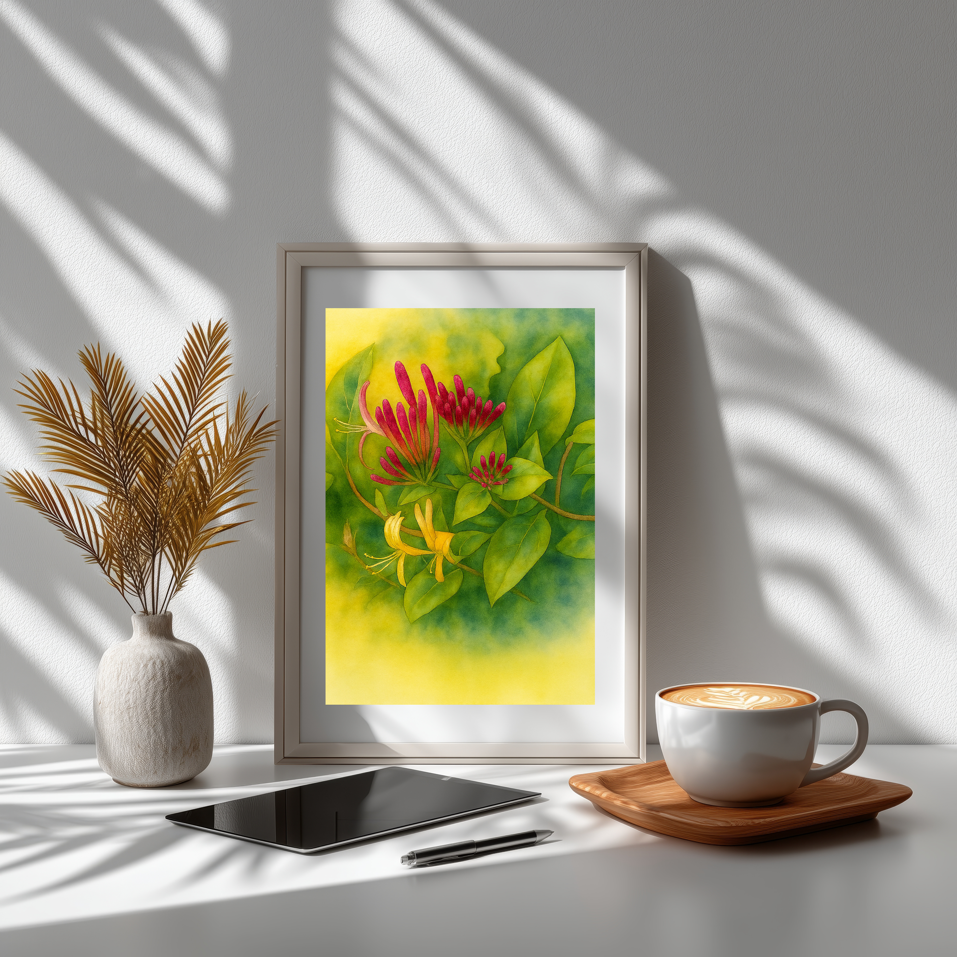 Graciösa trumpetformade blommor spirar runt smala stjälkar medan mjukt gröna blad ramar in kompositionen. Konstverket återspeglar den stilla karaktären hos Sveriges västkustlandskap, där kaprifolen ofta växer längs skogskanter och kustnära stigar.