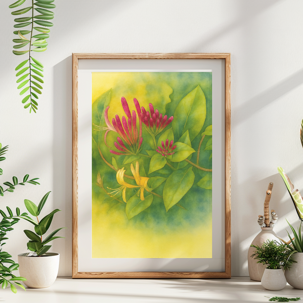 En botanisk poster inspirerad av Bohusläns landskapsblomma – den doftande och eleganta vildkaprifolen (Lonicera periclymenum). Denna raffinerade akvarellillustration hyllar svenskt botaniskt arv samtidigt som den fångar den naturliga skönheten hos en av Skandinaviens mest igenkännbara klätterväxter.