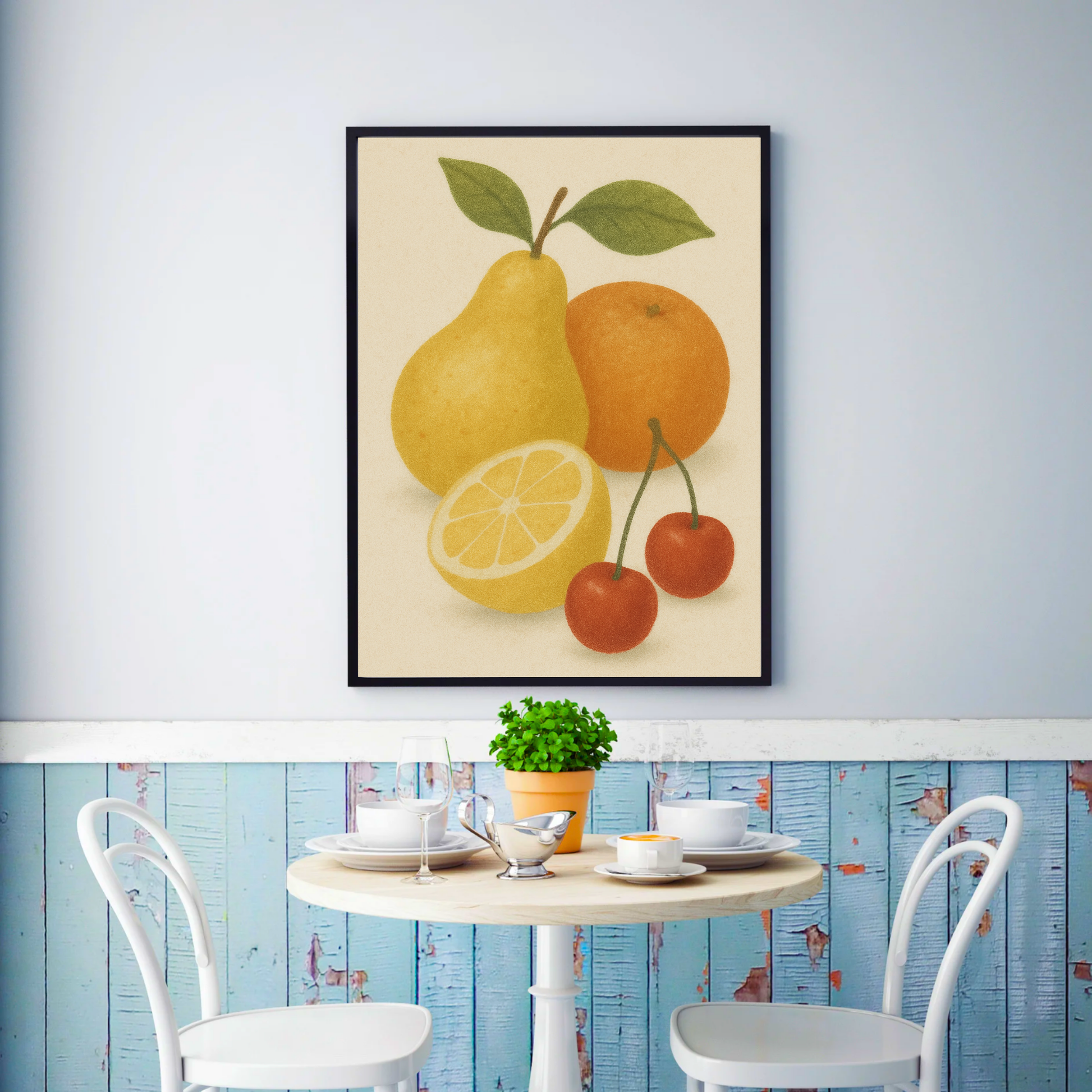 Detta konstverk presenterar en balanserad komposition av färsk frukt – ett päron, en apelsin, en skivad citron och två körsbär – arrangerade i ett lugnt och harmoniskt stilleben. Mjuka texturer och varma naturliga färger skapar en tidlös estetik som påminner om vintage botaniska tryck och traditionell kökskonst.
