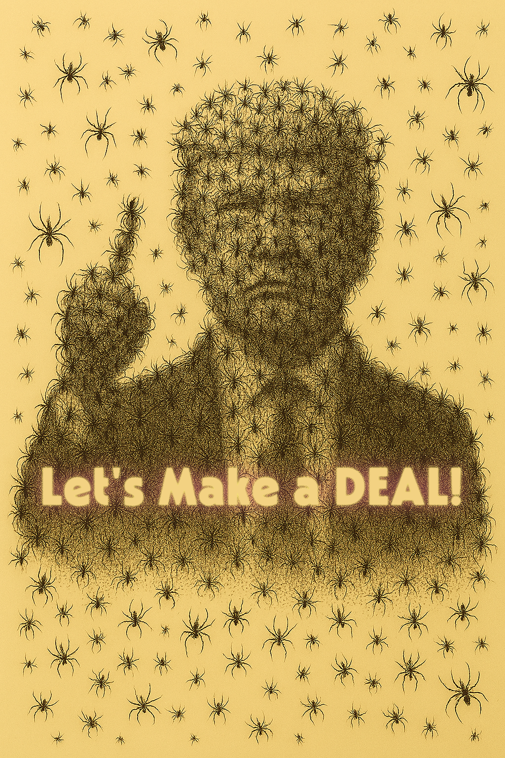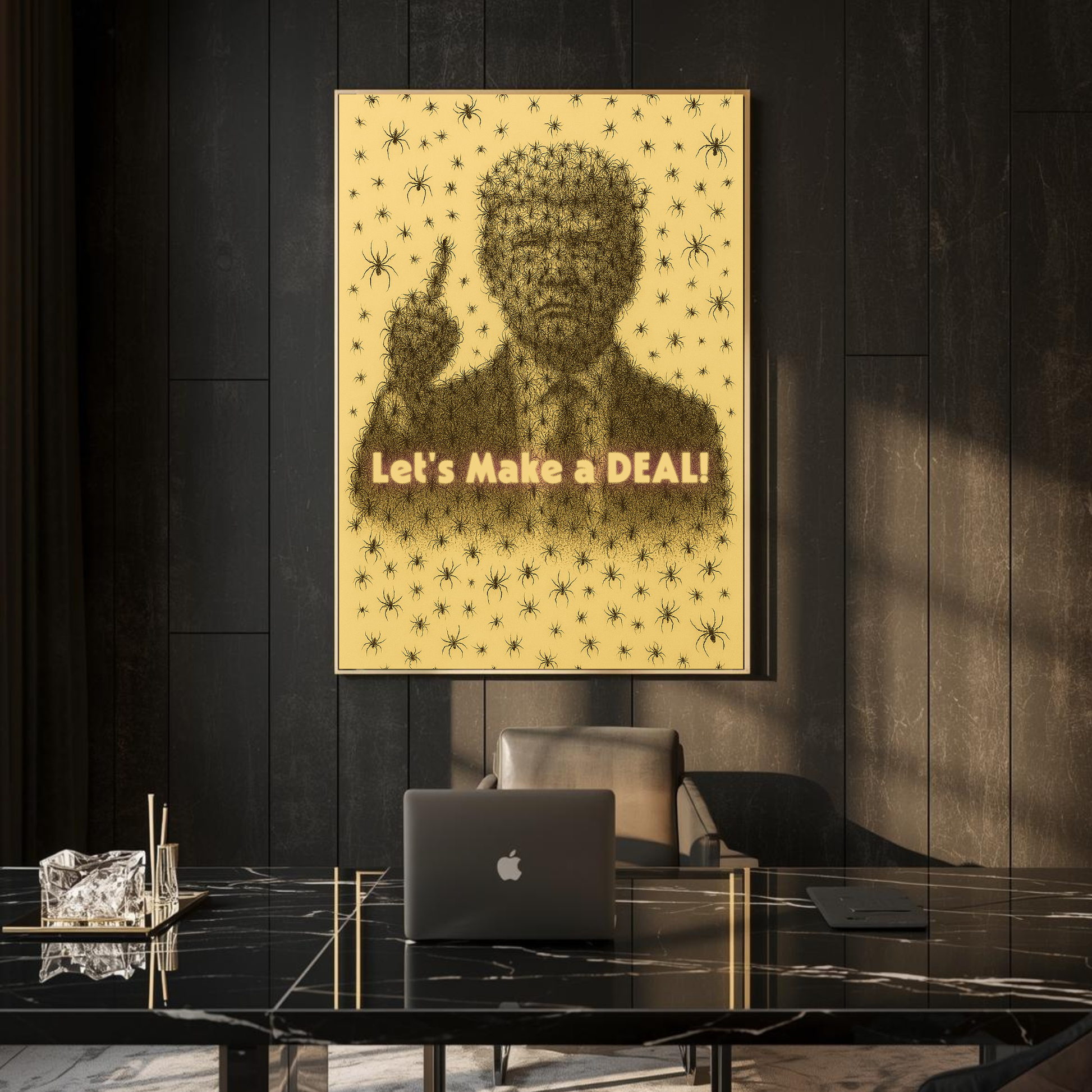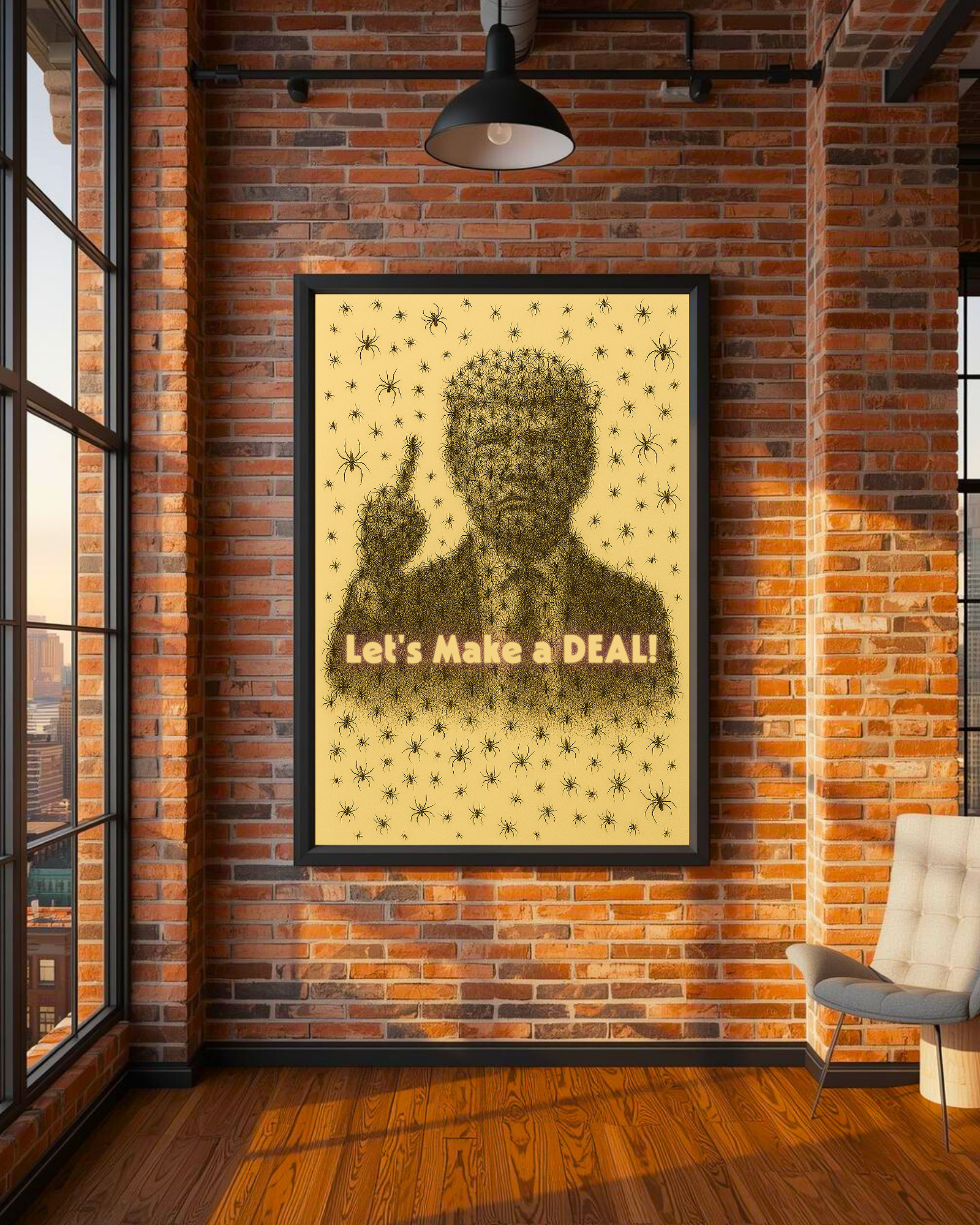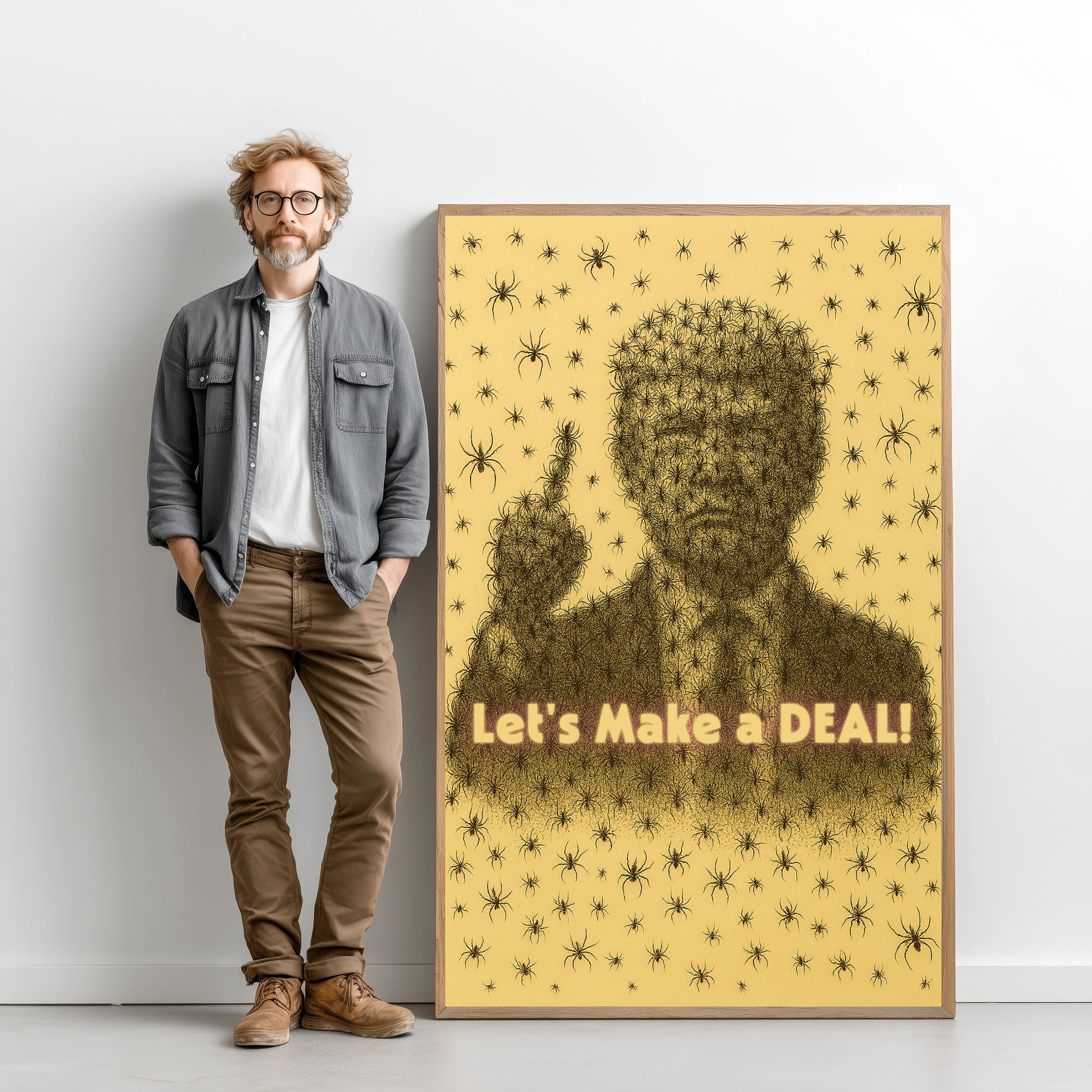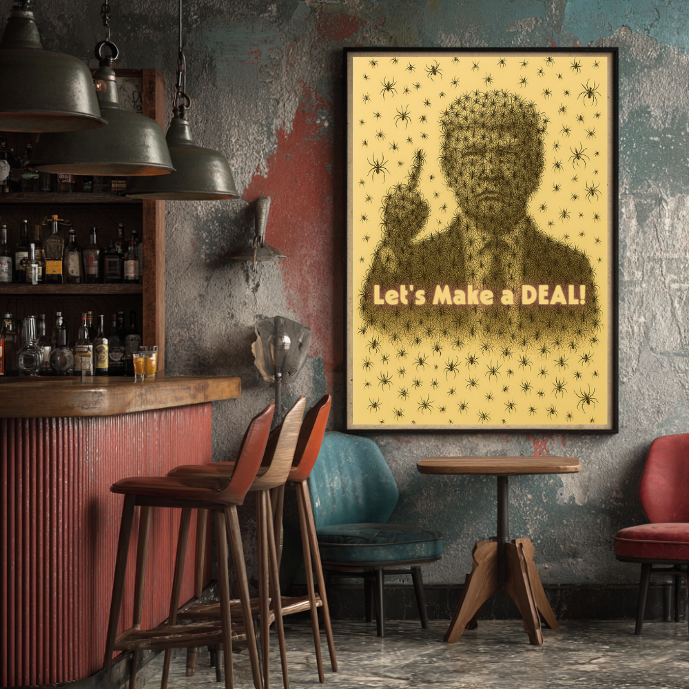 En tydlig, humoristisk statementposter som leker med makt, symbolik och samtida affärsverksamhet.