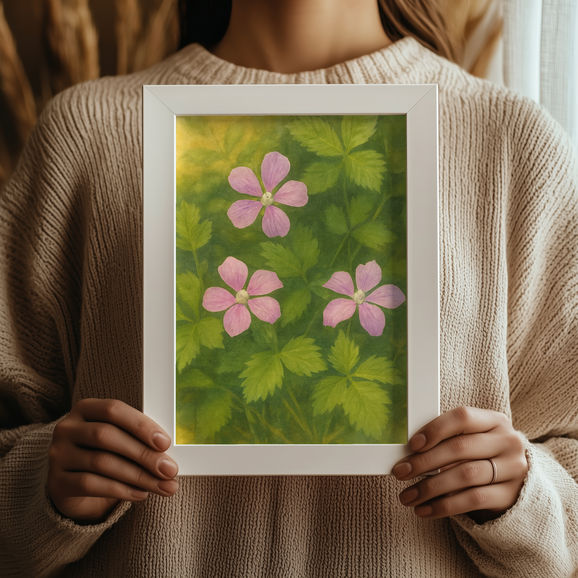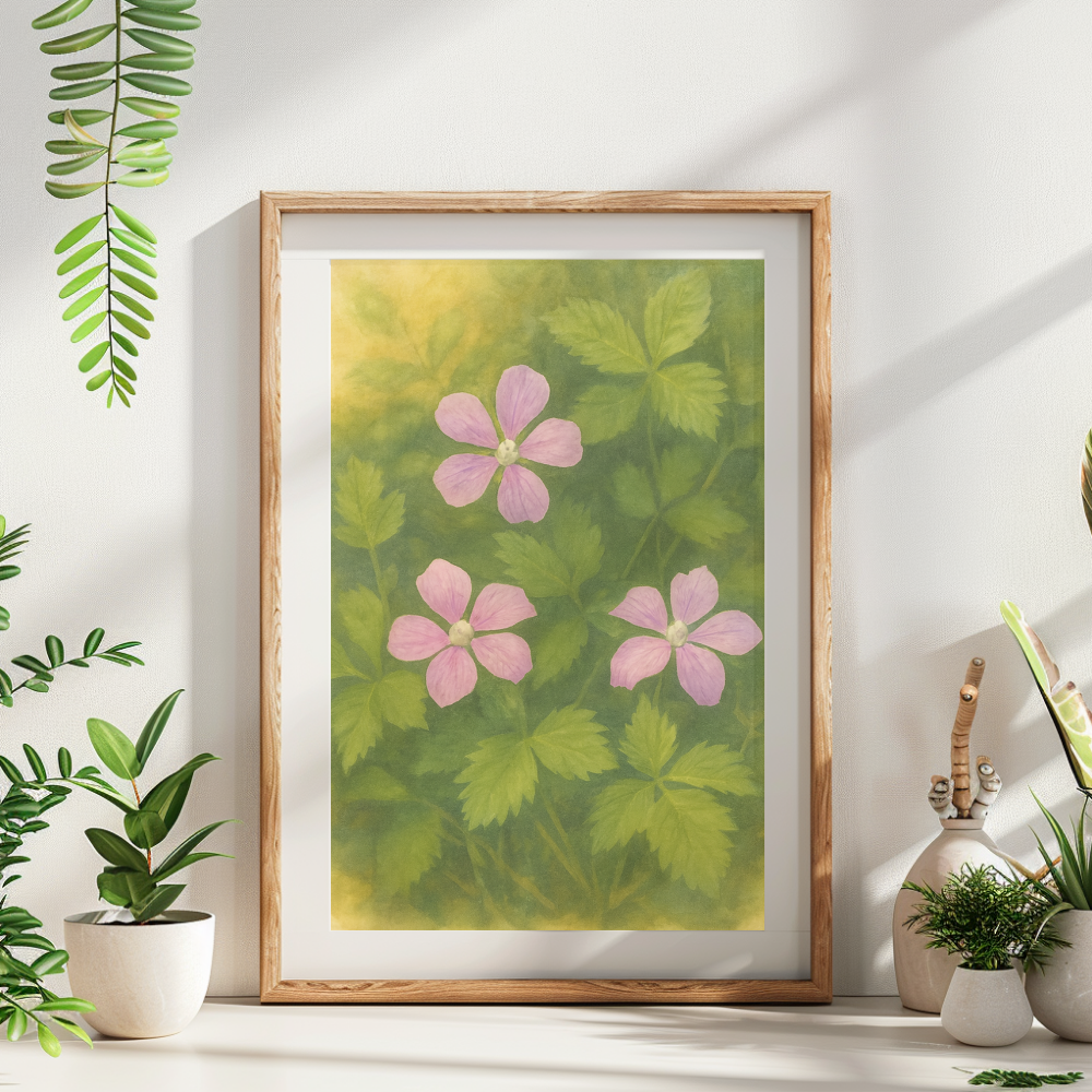 En botanisk poster med åkerbär (Rubus arcticus), Norrbottens landskapsblomma. Denna raffinerade illustration fångar den delikata skönheten hos en av Arktis mest unika växter och presenterar ett tidlöst stycke botanisk väggkonst inspirerad av nordliga landskap.