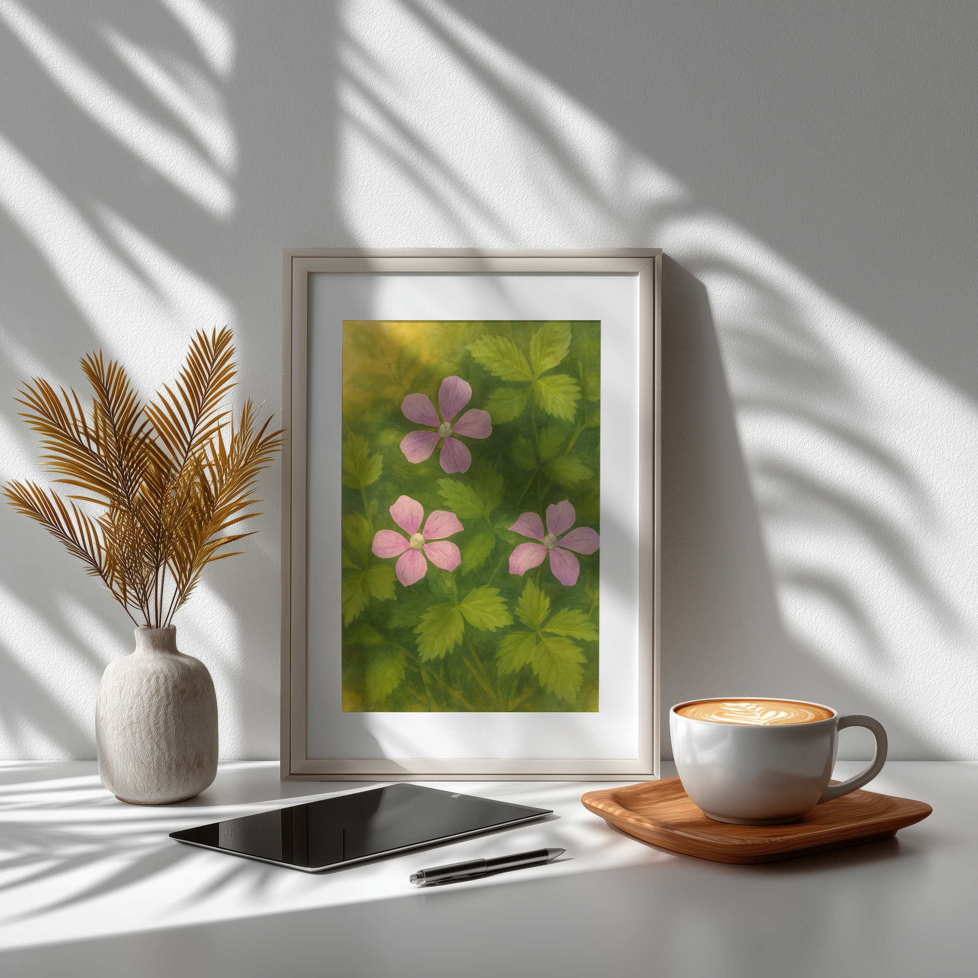 De mjukt lila-rosa blommorna och den lågväxande strukturen skapar en balanserad och elegant komposition, som speglar det öppna landskapet och det säsongsbundna ljuset i norra Sverige. Konstverket kombinerar botanisk precision med en minimalistisk skandinavisk estetik, vilket gör det lämpligt för både moderna interiörer och naturinspirerade rum.