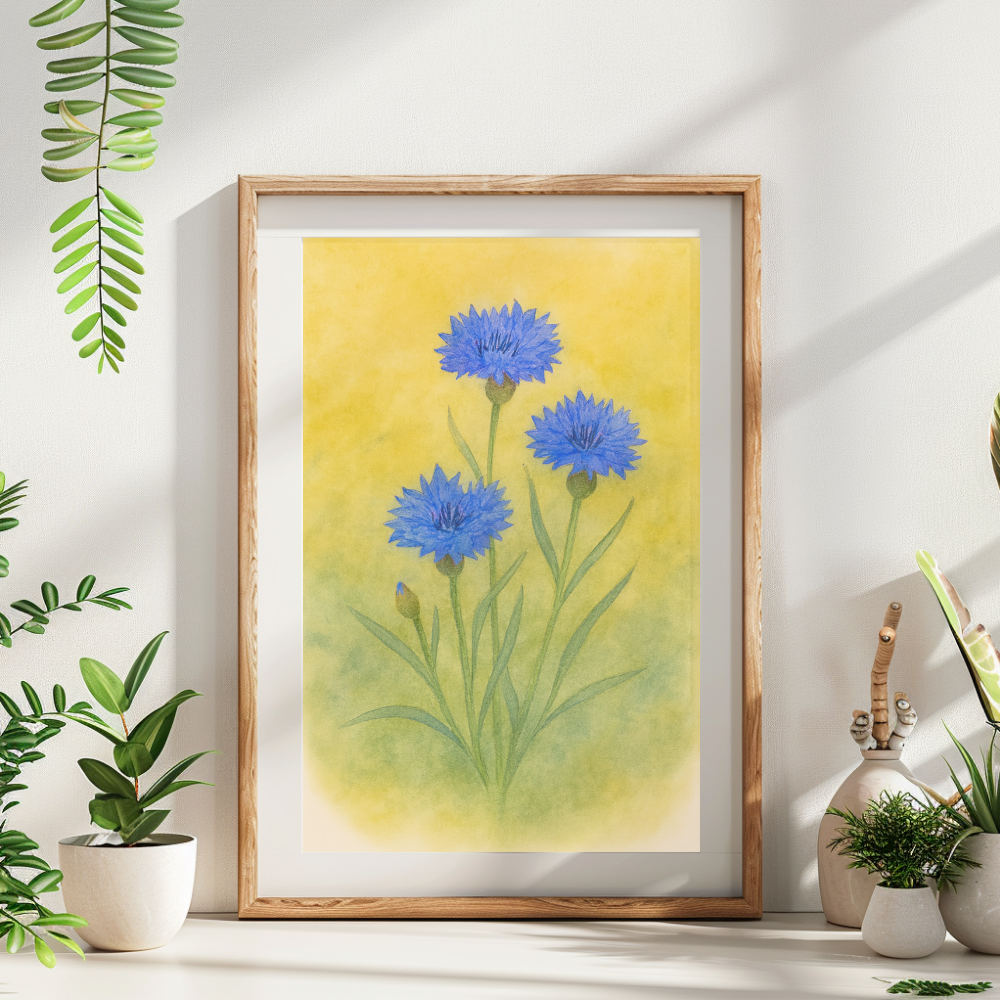 De intensiva blå kronbladen och den fina, luftiga formen skapar en slående men balanserad komposition som återspeglar öppna fält, jordbrukslandskap och sommarhimlar. Konstverket kombinerar botanisk precision med en minimalistisk skandinavisk estetik, vilket gör det lämpligt för både moderna inredningar och naturinspirerade miljöer.