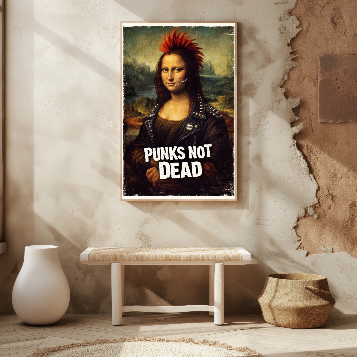 Punks Not Dead är ett djärvt och provokativt konstverk som återuppfattar ett av konsthistoriens mest igenkännbara porträtt genom ett perspektiv av uppror, individualitet och kulturell förändring. Genom att förena klassisk elegans med rå punk-attityd skapar konstverket en slående visuell kontrast som utmanar förväntningar och fångar uppmärksamhet direkt. Den ikoniska figuren, nu prydd med en röd mohawk, piercingar och en nitad läderjacka, blir en kraftfull symbol för självständighet, yttrandefrihet och vägran att anpassa sig.