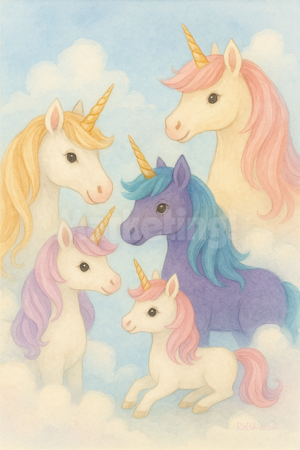 En mjuk och drömsk illustration med flera enhörningar samlade bland moln på en sagoinspirerad himmel. De milda pastellfärgerna, de mjuka formerna och de vänliga uttrycken skapar en magisk men ändå lugn atmosfär, perfekt för barnrum.