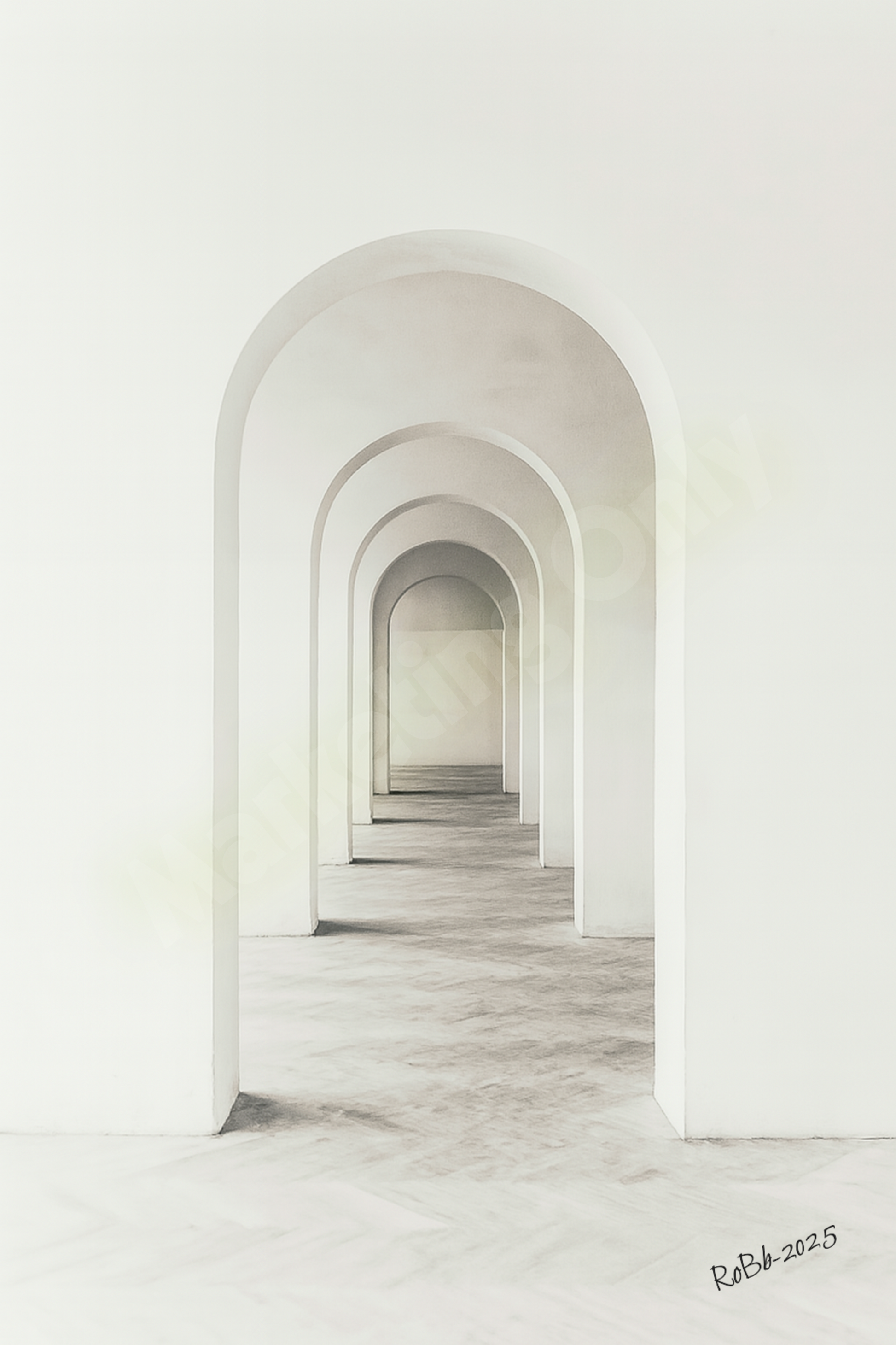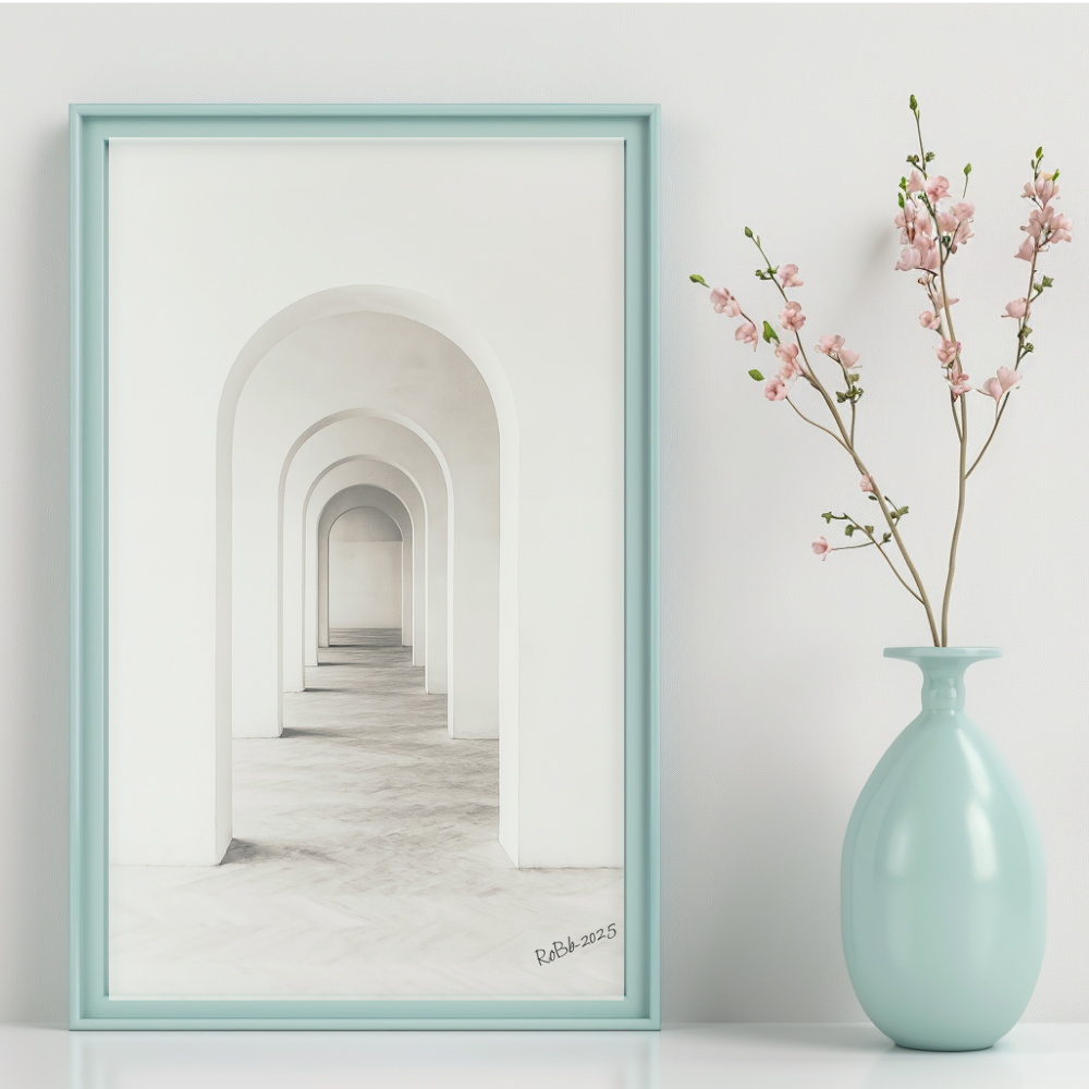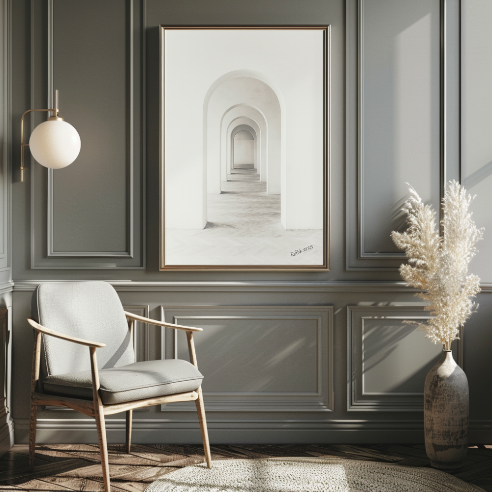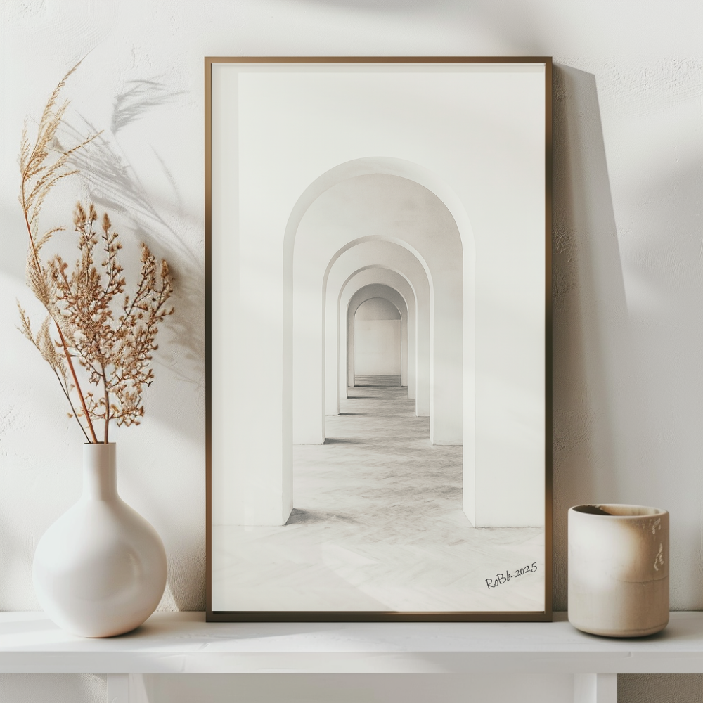 Bågen – Ljusets geometri är ett minimalistiskt konstverk som fångar den tidlösa skönheten i arkitektoniska former. Motivet visar en serie symmetriska valv där ljuset mjukt vandrar genom rummet och skapar en känsla av stillhet, balans och djup. Det subtila färgschemat i vitt och mjuka gråtoner gör verket till ett harmoniskt tillskott till både moderna och klassiska interiörer.